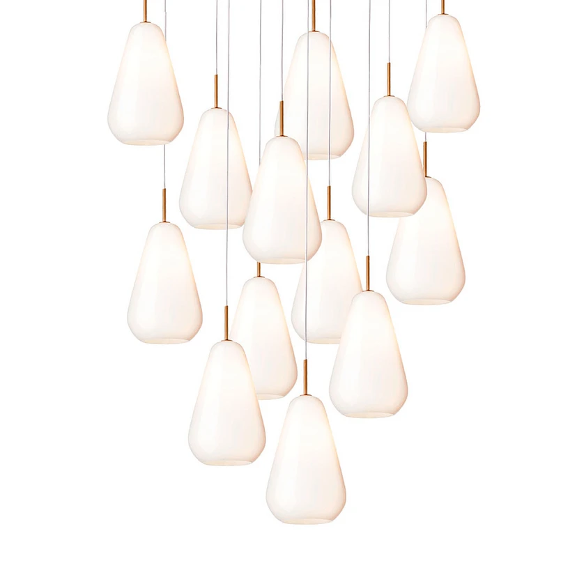 Kompozicija iš 13 lašelių formos stiklinių kūnų – priklausomai nuo varianto, švelnios opalo baltos arba subtilios auksinės spalvos – sukuria šiltą, subalansuotą šviesą. Sąmoningas formų kalbos paprastumas sukuria ramią, bet įspūdingą atmosferą, kuri ypač gerai atsiskleidžia aukštose patalpose.
