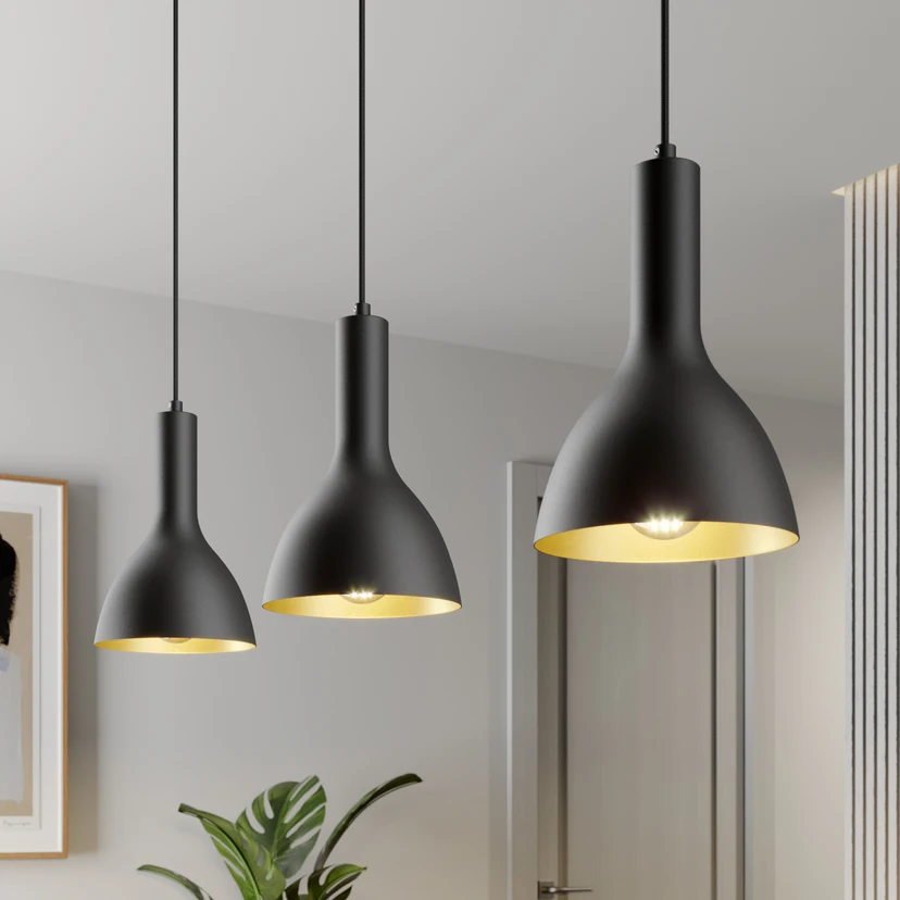 Juodos ir auksinės spalvos pakabinama lempa "Cosmina" su trimis lemputėmis – ideali valgomojo stalo ir baro lempai