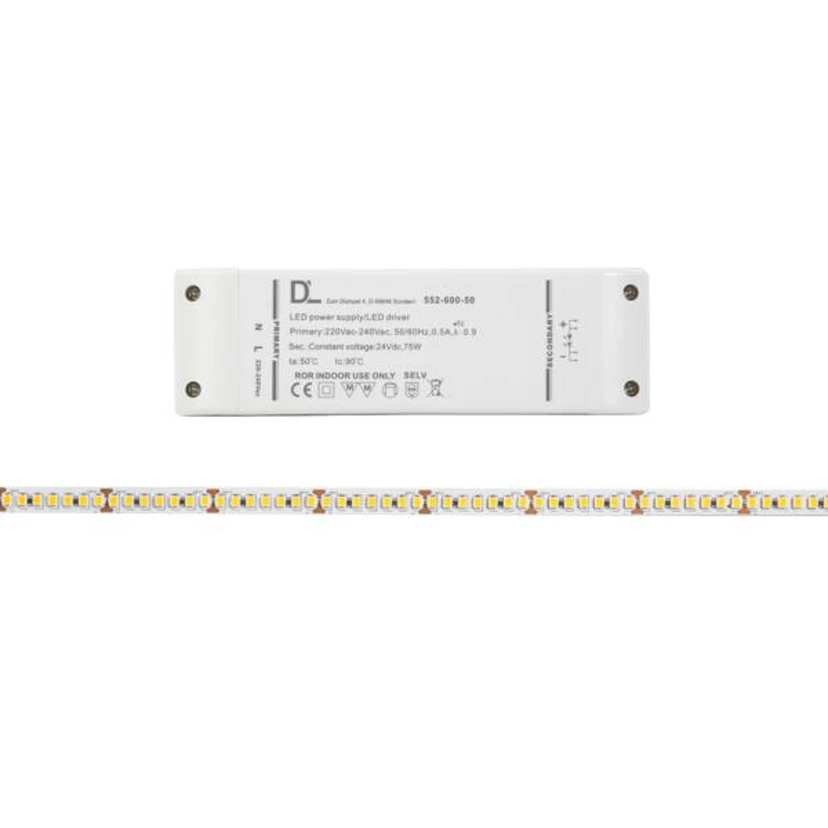 Ryški LED juosta "QualityFlex®", skirta profilių montavimui Ši sutrumpinama LED juosta idealiai tinka ilgoms atkarpoms apšviesti, kad būtų galima papildomai ar akcentuotai apšviesti modernius interjerus. QualityFlex® iš tikrųjų puikiai tinka kaip netiesioginis šviesos šaltinis virš arba už išsikišimų ir baldų, pavyzdžiui, ilgų virtuvės spintelių, spintelių ar gėrimų lentynų baruose. LED juosta netinka klijuoti tiesiai ant baldų ar sienų. Reikalingi tinkami aliuminio profiliai (žr. priedus) - Pristatymo apimtis: 500 cm ilgio LED juosta, dvipusė 3M lipni juosta, jungiamieji kabeliai po 350 cm iš abiejų pusių (sulituoti), du jungiamieji kabeliai po 150 cm (Plug & Play), vienas maitinimo blokas - Aplinkos temperatūra: nuo - 10 iki + 40 °C