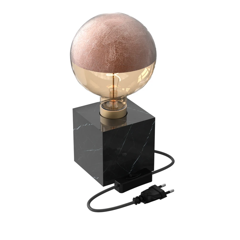 "Calex" kubo formos stalinė lempa "Square Marble", pagaminta iš marmuro, su jungikliu ant laido "Calex" kubo formos stalinė lempa "Square Marble" pagaminta iš marmuro, todėl žavi elegantiška išvaizda. Kištukinis lizdas apjuostas aukso spalvos metalo juostele ir skirtas laisvai pasirenkamam E27 šviesos šaltiniui. Ypač tinka šviesos šaltiniai su matomomis gijomis ir didelės gaubtinės lempos. Tinkamus variantus galima įsigyti atskirai per priedus. Jungiklis (įjungimo / išjungimo) yra integruotas į maitinimo laidą.