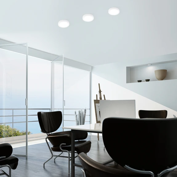 "Fueva-C" - apvalus LED lubų šviestuvas, valdomas programėle arba nuotolinio valdymo pulteliu Su "Fueva-C" LED lubų šviestuvu galima pasiekti kintamą apšvietimą įvairiomis šviesos spalvomis ir ryškumo lygiais. Jį galima valdyti išmaniuoju telefonu ar planšetiniu kompiuteriu arba nuotolinio valdymo pulteliu, naudojant programėlę, skirtą IOS ir "Android" operacinėms sistemoms. Apvalus, plokščias "Fueva Connect" LED lubų šviestuvas užtikrina baltą apšvietimą, kurį galima tolygiai reguliuoti nuo šiltai baltos (2 700 K) iki dienos šviesos (6 500 K), arba spalvotą apšvietimą vienu iš daugiau kaip 16 milijonų skirtingų spalvų niuansų. Nepriklausomai nuo pasirinktos šviesos spalvos, šviesą galima tolygiai pritemdyti kiekviename nustatyme. Šviesą galima valdyti net keliaujant namuose. Kurti ir išsaugoti savo šviesos kūrinius, jungti atskirus šviestuvus į grupes, keisti spalvas skirtingu greičiu - tai ir dar daugiau galima su "Fueva Connect" LED lubų šviestuvu per atsisiųstą programėlę išmaniuoju telefonu arba planšetiniu kompiuteriu. Apvalų paviršinį LED šviestuvą, pagamintą iš lieto metalo su satinuotu plastikiniu difuzoriumi, galima integruoti į beveik bet kokią kambario koncepciją. Kaip priedą galima užsisakyti nuotolinio valdymo pultelį, skirtą alternatyviam valdymui be išmaniojo telefono arba planšetinio kompiuterio. Net ir tokiu būdu valdant galima pasirinkti įvairias baltos ir spalvotos šviesos spalvas, tolygiai reguliuoti ryškumą, nustatyti spalvų perėjimus ir greičius arba pasirinkti išsaugotus mėgstamiausius. Nuotolinio valdymo pultas taip pat gali būti integruotas į programą kaip grupė, kurioje galima laisvai apibrėžti grupę (atskirus šviestuvus arba patalpas).