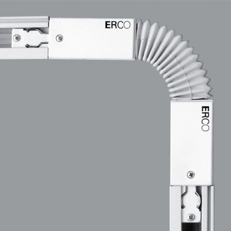 Daugiafunkcinė jungtis, skirta ERCO 3 fazių bėgiams Ši jungtis su plastikiniu korpusu ir lanksčia centrine dalimi naudojama kaip lanksti jungtis tarp dviejų 3 fazių bėgių. Galimas įvadas, per laidus.