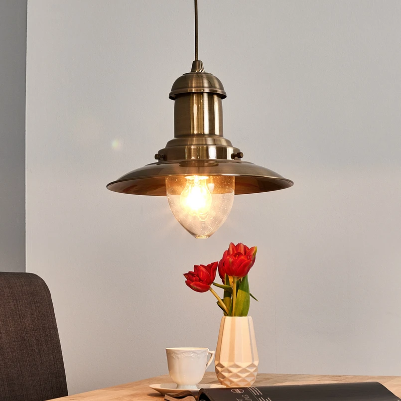 Senovinės išvaizdos jūrinis pakabinamas šviestuvas FISHERMAN Pakabinamas šviestuvas FISHERMAN bet kurioje gyvenamojoje erdvėje sukuria jūrinę atmosferą ir primena jaukią žvejo trobelę, kurią apšviečia maloni skoningo šviestuvo šviesa. Klasikinio dizaino metalinis gaubtas gali būti dviejų skirtingų spalvų, kurios abi sumaniai pabrėžia senovinę šviestuvo išvaizdą. Antikvarinio žalvario ir antikvarinės rudos spalvos pakabinamas šviestuvas yra laikui nepavaldi klasika, kuri į kambarį įneša jūros oro dvelksmą. Be to, jis užtikrina ryškų apšvietimą dėl skaidraus stiklo gaubto.