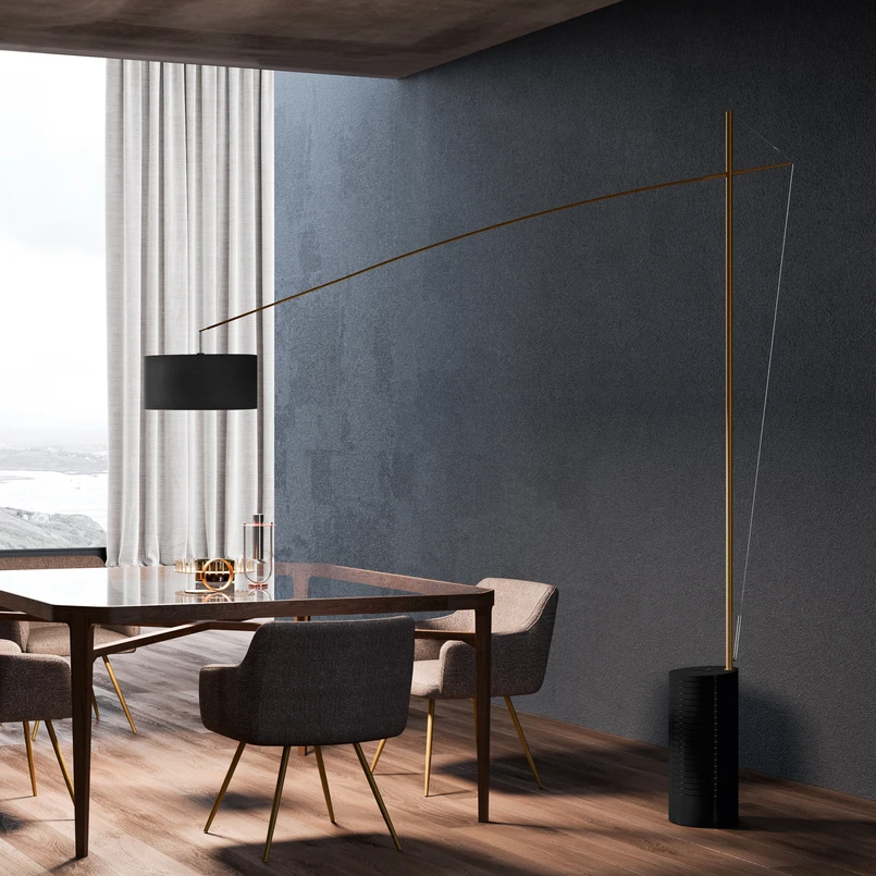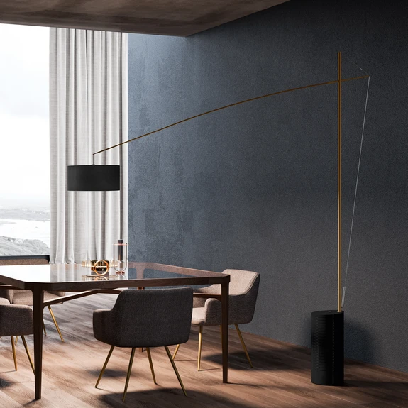 Stilingas "Gru" lenktas grindų šviestuvas iš aliuminio ir audinio su cilindro formos gaubtu "Gru" lenktas grindų šviestuvas puikiai atrodo šalia sofos ar valgomojo stalo. Nuo įspūdingo pagrindo kyla platus strypas, kuris kartu su kitu strypu baigiasi cilindriniu gaubtu. Šiame gaubte puikiai telpa E27 lemputė ir sukuria malonią šviesą, kuri dėl žemyn pasvirusio gaubto užtikrina gerą apšvietimą. Kontrastingas tamsių ir šviesių spalvų derinys suteikia šviestuvui stilingumo ir sukuria harmoningą bendrą vaizdą. Išplati "Gru" arkinio grindų šviestuvo išorė sukuria jaudinantį įspūdį ir bet kurį kambarį paverčia kažkuo ypatingu. Jis lengvai įsilieja į modernius baldų stilius ir yra puikus palydovas skaitant knygas vakare arba apšviečiant valgomojo stalą.