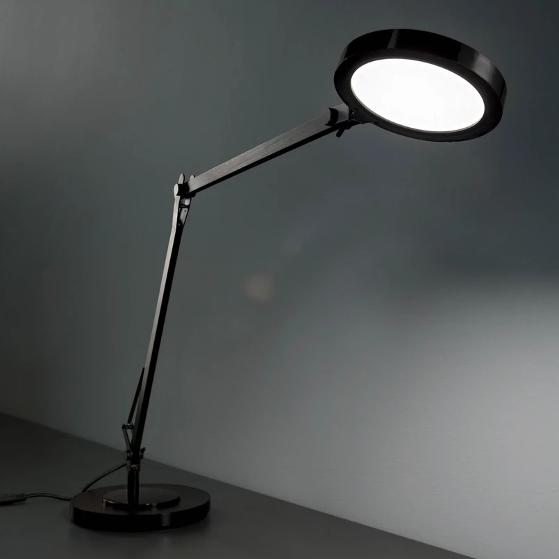 "Futura" LED stalinė lempa su daugybe jungčių "Futura" - tai LED stalinė lempa, kuri puikiai tinka kaip stalinė lempa dėl daugybės reguliavimo galimybių, aukščio, didelio šviesos srauto ir universalios baltos šviesos spalvos. Apvalią lempos galvutę galima pasukti ir reguliuoti pagal poreikį naudojant dvi šarnyrines rankenas. Šviestuvas pagamintas iš aliuminio ir plastiko, turi apvalų pagrindą, užtikrinantį stabilumą - su jutikliniu reguliatoriumi