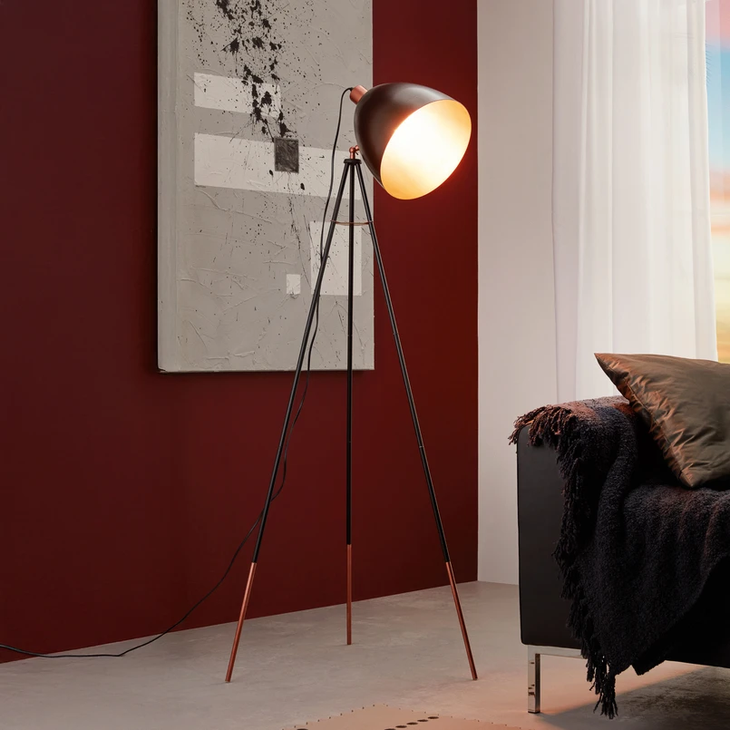 Trijų kojų "Chester" grindų šviestuvas su vario detalėmis Dėl trijų kojų rėmo ir matinės juodos bei žvilgančio vario spalvų derinio "Chester" grindų šviestuvas yra madingas. Gobleto formos metaliniame gaubte yra praktiškas ištraukiamasis jungiklis, kad apšvietimą būtų galima įjungti tiesiai ant lempos. Įjungus šviestuvą vario spalvos gaubto vidus efektingai išryškėja ir skleidžia šiltą šviesą.