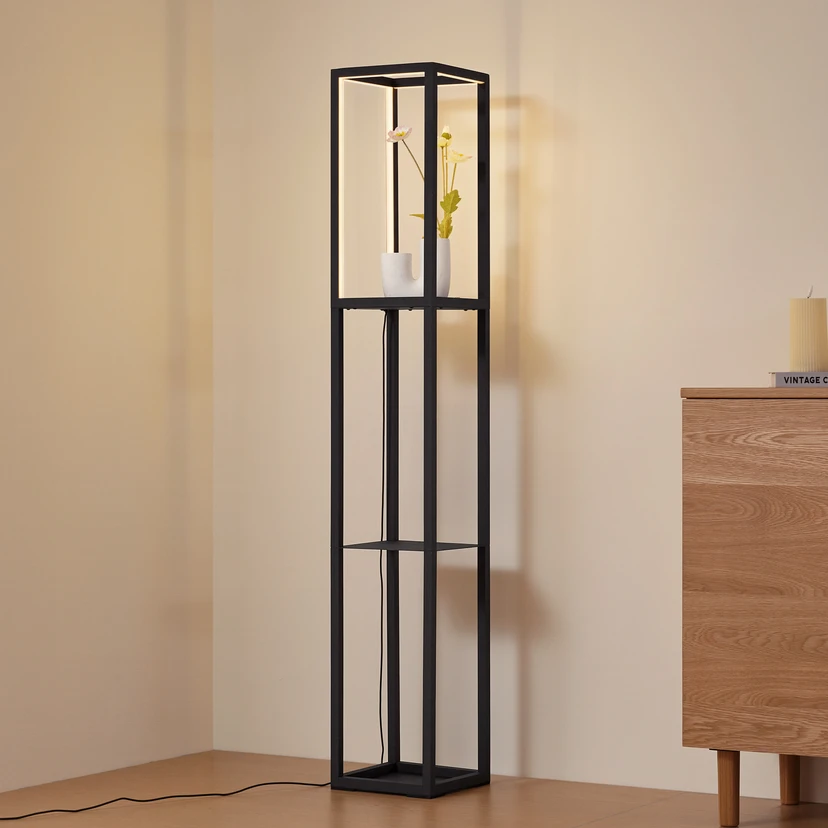 Juoda, kampuota LED stovinė lempa Birta, lentynos formos