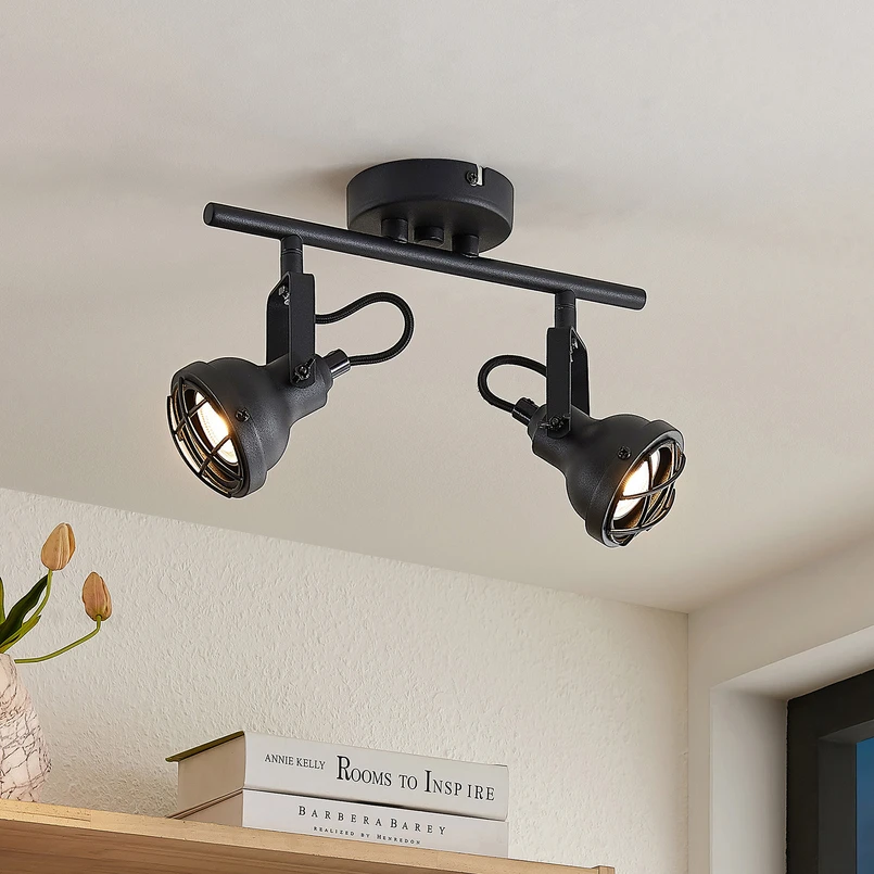 "Lowani" pramoninis lubinis prožektorius su kilnojamais gaubtais "Lowani" yra tamsus lubinis prožektorius, kuris iš karto atkreipia dėmesį į lubas, net kai jis nenaudojamas. Jo korpusas ir du gaubtai pagaminti tik iš juodo plieno, kaip būdinga pramoniniam stiliui. Prie horizontalios atramos pritvirtintos dvi šakutės, kurios laiko gaubtus ir yra gana manevringos. Jų dėka gaubtus galima lengvai pasukti ir pakreipti, kad galėtumėte nukreipti šviesą taip, kaip norite.