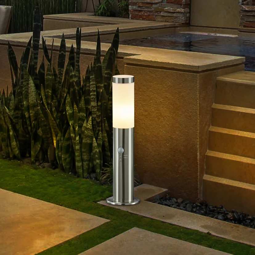 Statius – iš nerūdijančio plieno pagamintas lauko grindų šviestuvas su praktišku judesio jutikliu