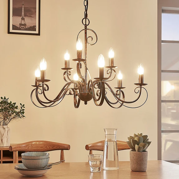 Gražus senovinės išvaizdos "Caleb" šviestuvas "Caleb" - tai šviestuvas, kuris į kambarį įneša daug romantikos, nes jo rankenos yra įspūdingai ir gražiai išlenktos, todėl beveik galima kalbėti apie žaismingą išvaizdą. Šis šviestuvas ypač dera prie visų stilių, kurie gali būti siejami su užmiesčio namų stiliumi arba kaimiška atmosfera. Šviestuve "Caleb" įmontuotos devynios E14 lemputės.