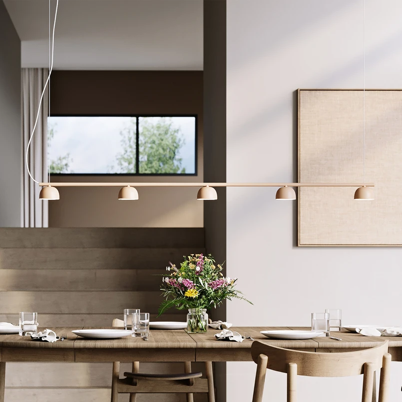 Skandinaviško dizaino penkių lempučių "Blush" LED pakabinamas šviestuvas iš plieno "Blush" yra puikus kompanionas apšviečiant valgomojo stalą. Pailgą LED pakabinamą šviestuvą sudaro horizontaliai prie pakabos pritvirtintas strypas, ant kurio pritvirtinti penki gaubtai. Šiuose gaubtuose sumontuoti šviesos diodai ir sukuria šiltai baltą, neakinantį apšvietimą. Norvegų dueto Morten & Jonas sukurtas šviestuvas užima centrinę vietą neužimdamas dėmesio. Šviestuvą pagamino bendrovė "Northern" ir jis atitinka siekį derinti grožį su funkcionalumu. Jų kūryba neapsiriboja norvegišku paveldu, kad patenkintų šiuolaikinį atsipalaidavusios prabangos ir modernaus šaltumo poreikį. Northern" gaminiai gali paversti bet kokią aplinką unikalia, suteikti jai atmosferos ir kartu atskleisti naują šiaurietiško stiliaus versiją.