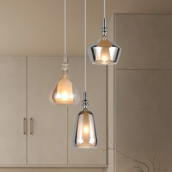 Trys šviesos šaltiniai kartu užtikrina subalansuotą, šiltą šviesą, kuri kiekvienai patalpai suteikia ypatingą atmosferą. Taigi pakabinamas šviestuvas „Aldea“ puikiai tinka minimalistiniam ir moderniam interjero stiliui, taip pat patalpoms, kuriose išskirtinumą suteikia elegantiškos detalės. Šviestuvas derina matinį baltą metalą su gintaro spalvos ir chromu padengtais stiklo korpusais – tai patrauklus šiltų, jaukių atspalvių ir šalto elegantiškumo derinys. Šis derinys ne tik sukuria įdomų šviesos žaismą, bet ir suteikia šviestuvui nepakartojamą išvaizdą.