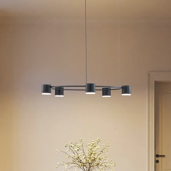 Pakabinamas šviestuvas „Kodo“ iš milteliais dengto plieno, modernaus dizaino, elegantiškos juodos spalvos, puikiai tinka valgomojo, svetainės ar virtuvės interjerui. Penki cilindriniai gaubtai su GX53 lempų laikikliais išdėstyti aplink metalinį žiedą, todėl užtikrinamas tolygus apšvietimas.
