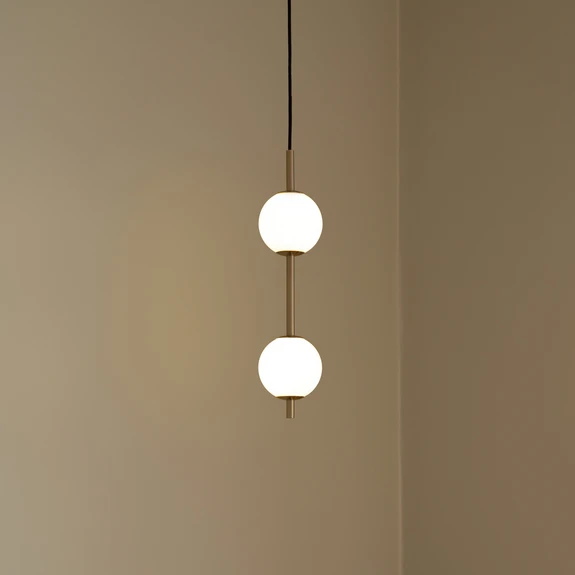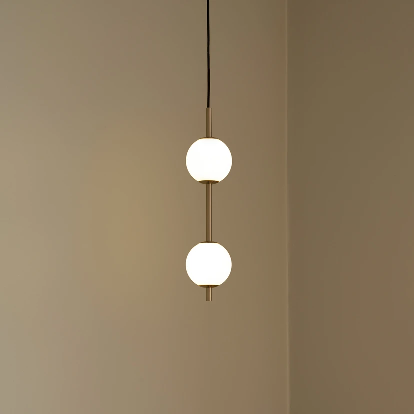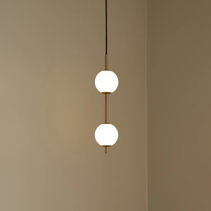 LED pakabinamas šviestuvas „Audrey“ su žalvario apdaila ir dviem visapusiškai spindinčiomis opalo stiklo rutuliais
